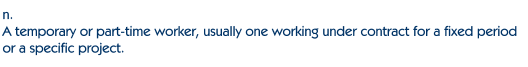 | | Agency Contractor | This worker is sourced through a typical temporary staffing agency providing labor for a temporary need or staff augmentation. The worker is paid wages on an hourly basis by their providing supplier and temporarily supplements to the workforce or replaces headcount until a position can be filled. The work can be task oriented (such as light industrial or clerical) or more knowledge based or highly skilled (such as Information Technology. Their work is directed daily by a manager.